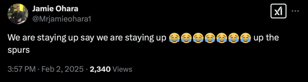 O’Hara said: “We are staying up, say we are staying up – up the Spurs”, accompanied by seven laughing emojis.