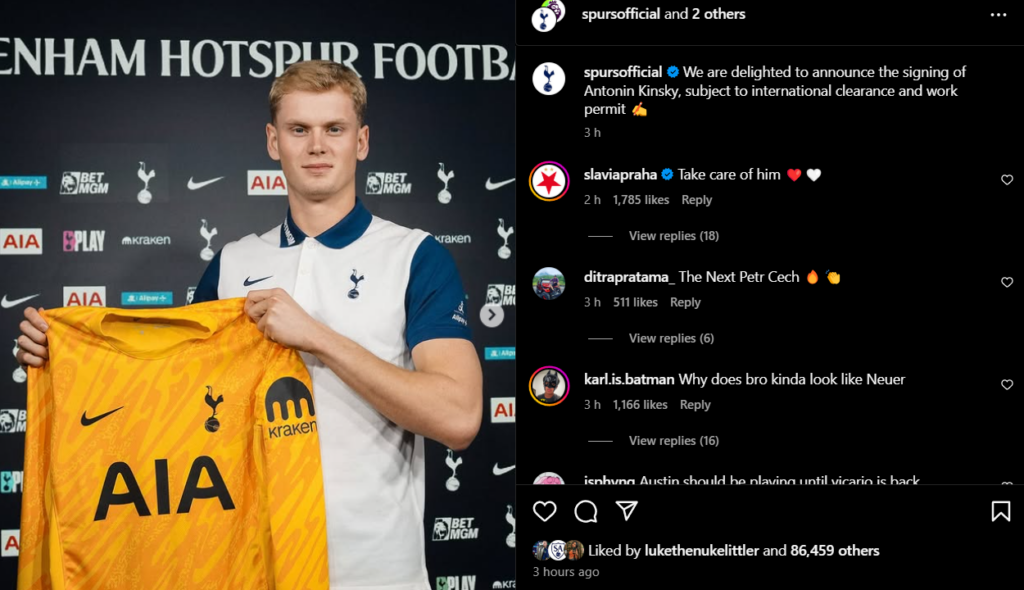 Luke Littler has reacted on Instagram after the announcement of Tottenham signing goalkeeper Antonin Kinsky.