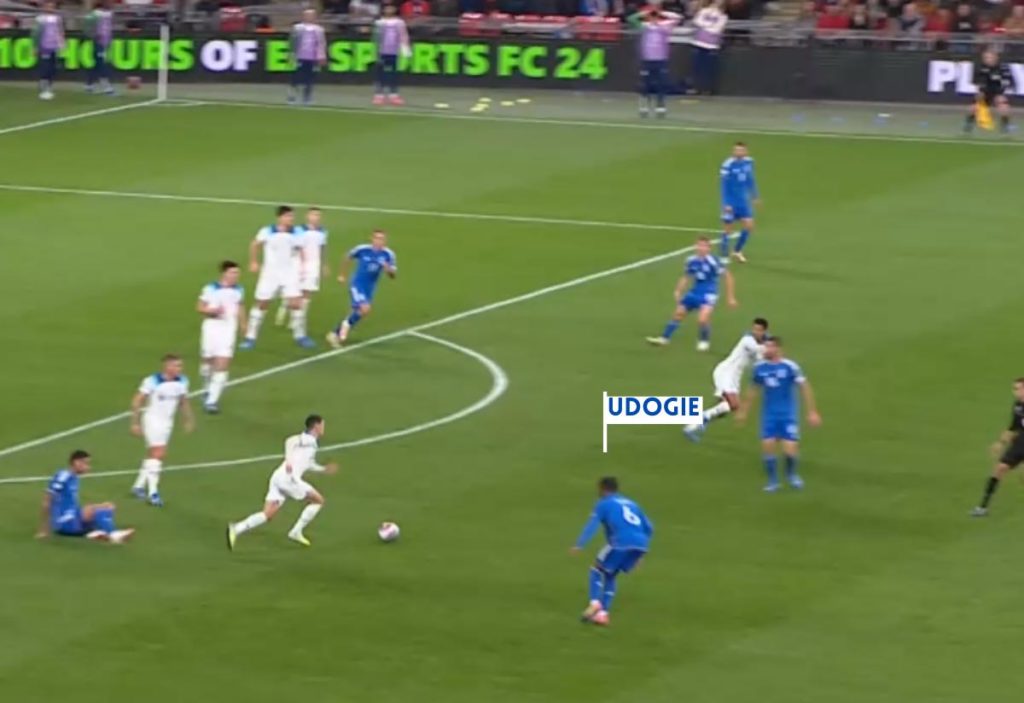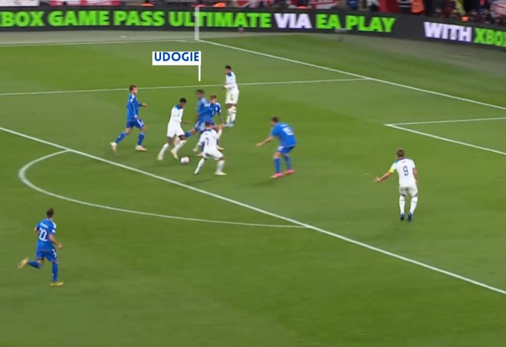 For England’s second goal, Udogie was found out massively by England.