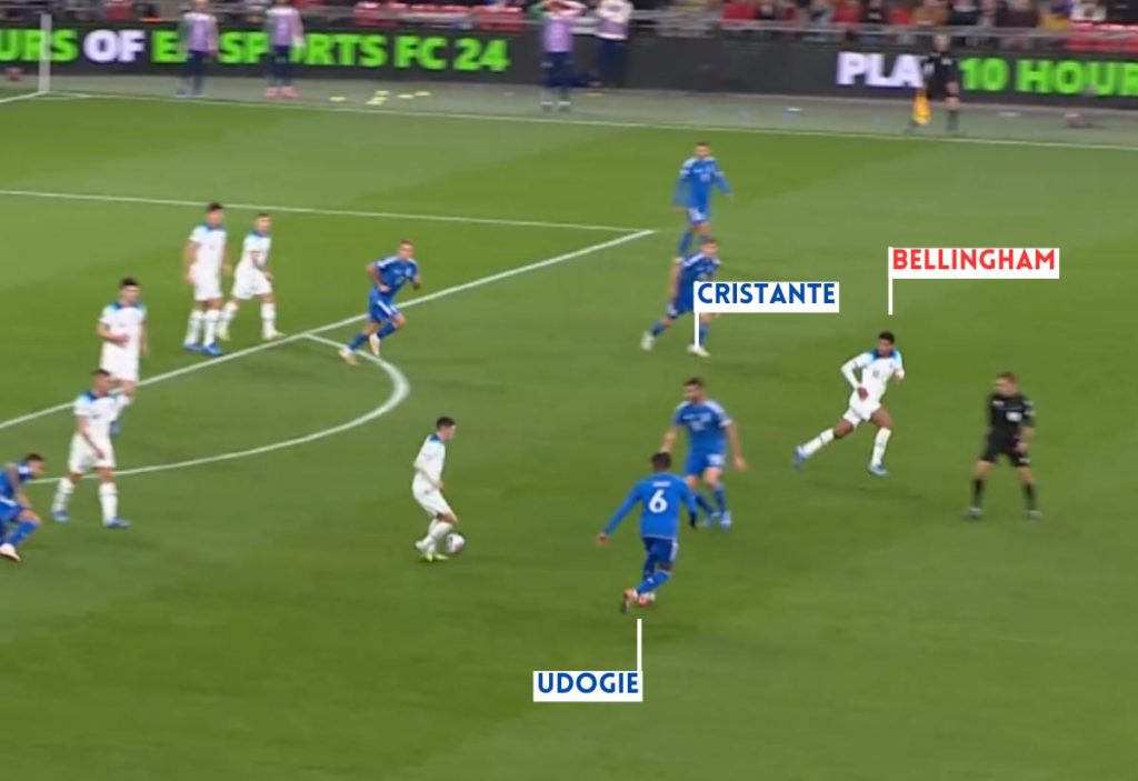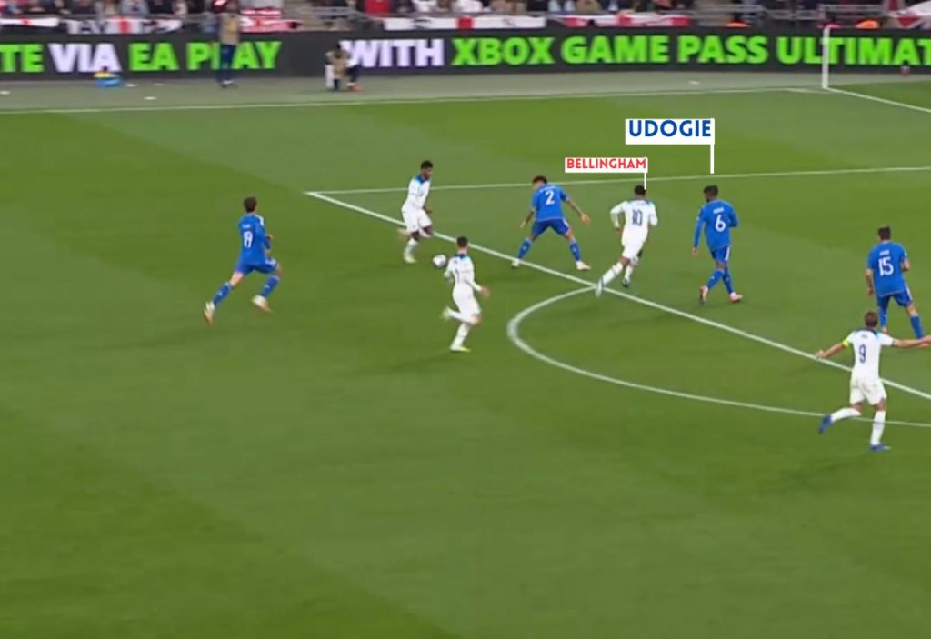 Bellingham then receives the ball from Foden and continues the England counter-attack at an alarming pace for Italy’s defenders, causing Udogie to scramble back as quickly as possible.