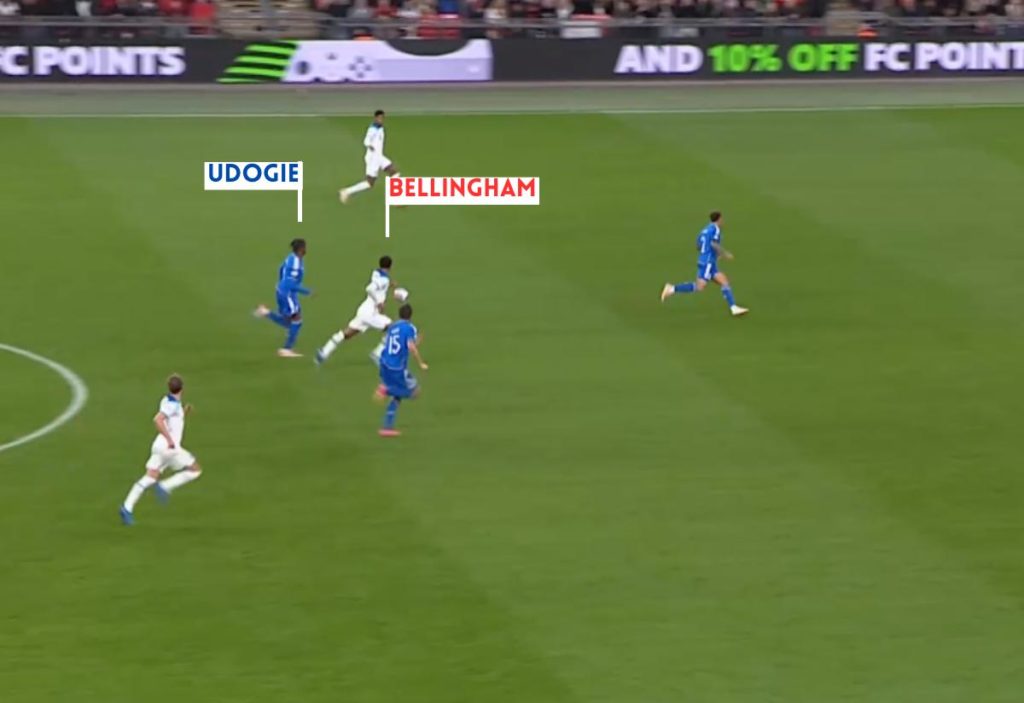 You can see in the next image how well Udogie kept up with Bellingham despite the Real Madrid ace having a head start on the Spurs full-back.