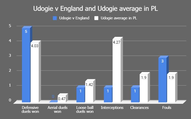 Compared to his season average for Tottenham, Udogie’s defensive numbers were mostly worse while playing for the Azzurri against the Three Lions.