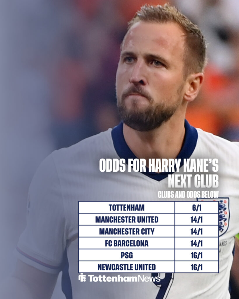 One major bookmaker has Kane as the odds-on favourite to remain at Bayern Munich (11/25); however, another has also tipped the former Tottenham striker to make a return ahead of joining any other clubs (8/1).